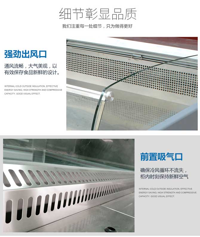 2:選用進口壓縮機,微孔式出風,冷氣均勻分布,豪華鮮肉柜柜內溫度穩定,食品不風干。豪華鮮肉柜柜內采用不銹鋼材料,耐腐蝕、易清潔,使用方便,且不污染食品。